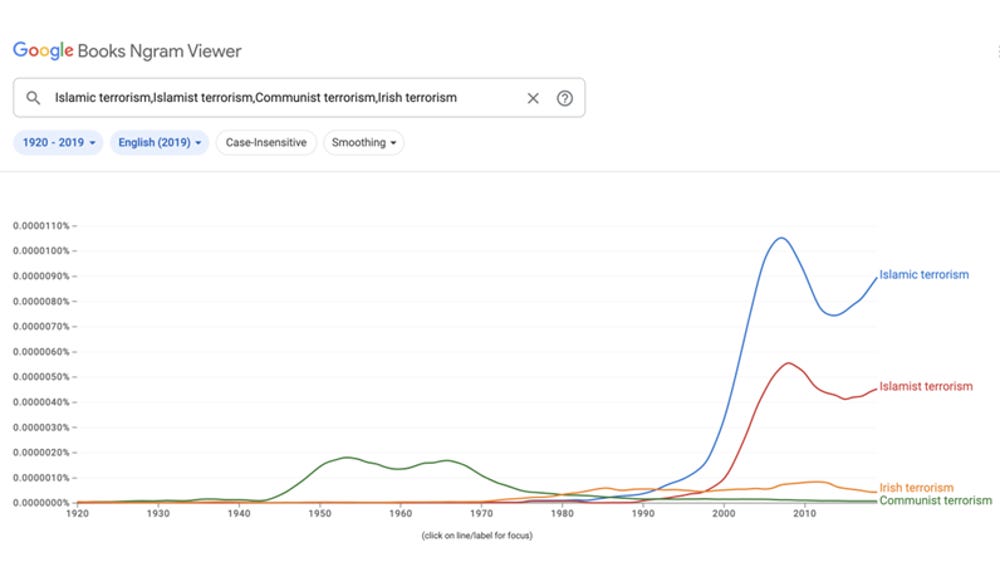 This shows the total dominance in English of discussion of negatively evaluated political violence and its association with Islam from the mid-1990s onwards.