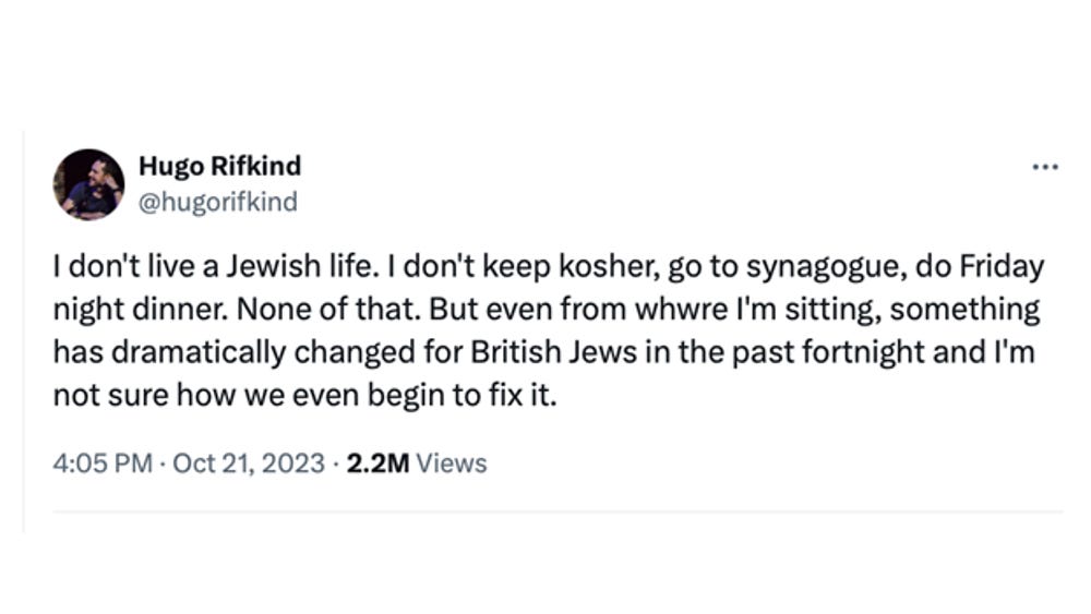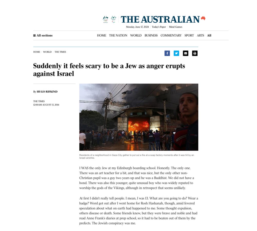 Hugo Rifkind, son of the former Foreign Secretary, Malcolm Rifkind, who cultivates the air of one who isn’t a Zionist but has just been “mugged by reality” in being confronted by a recent upsurge in anti-Semitism which he first noted in 2014 and was still noting, as if afresh, in 2023. At a Union of Jewish Students event in February 2024 he lamented the existence of the “already… fairly strong anti-Zionist element from his early journalistic career covering student politics saying “I remember thinking at the time, ‘that’s unfortunate, I hope that goes away’.