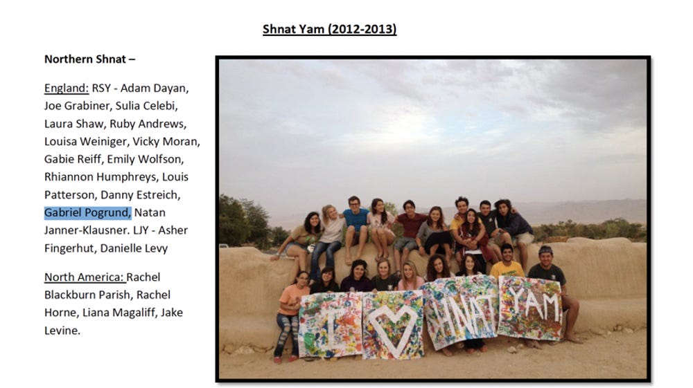 Gabriel Pogrund, is a South African Zionist, a former member of the RSY-Netzer Zionist youth group, which he first had “contact” with in 2009. He attended one of their colonial year-long visits to occupied Palestine in 2012-3.