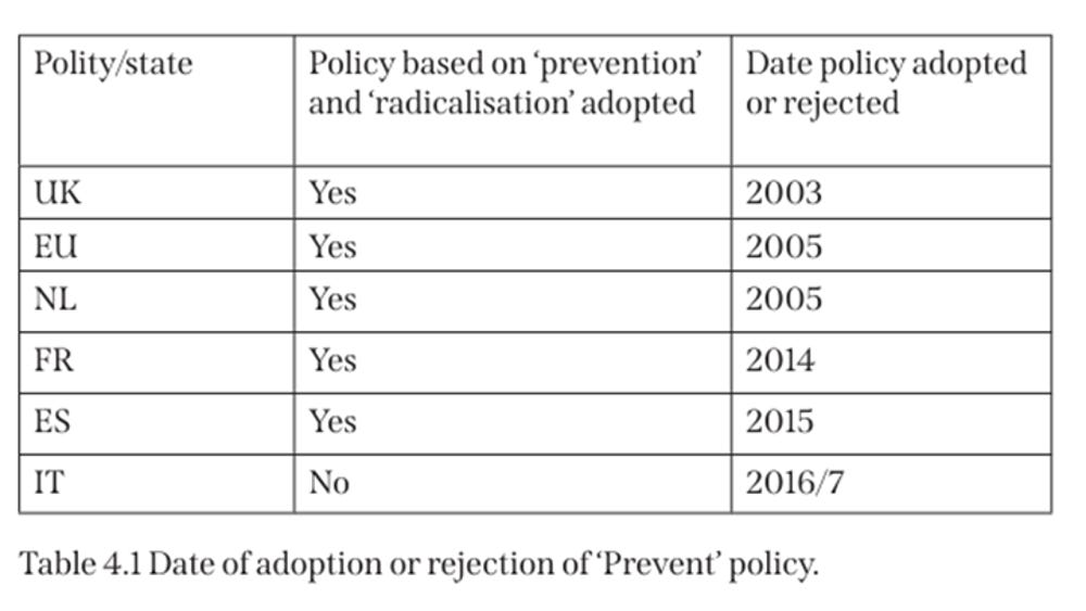 Between 2003 and 2015, the following policies adopted neoconservative counter-terror policies in this order: the United Kingdom, European Union, Netherlands, France and Spain.