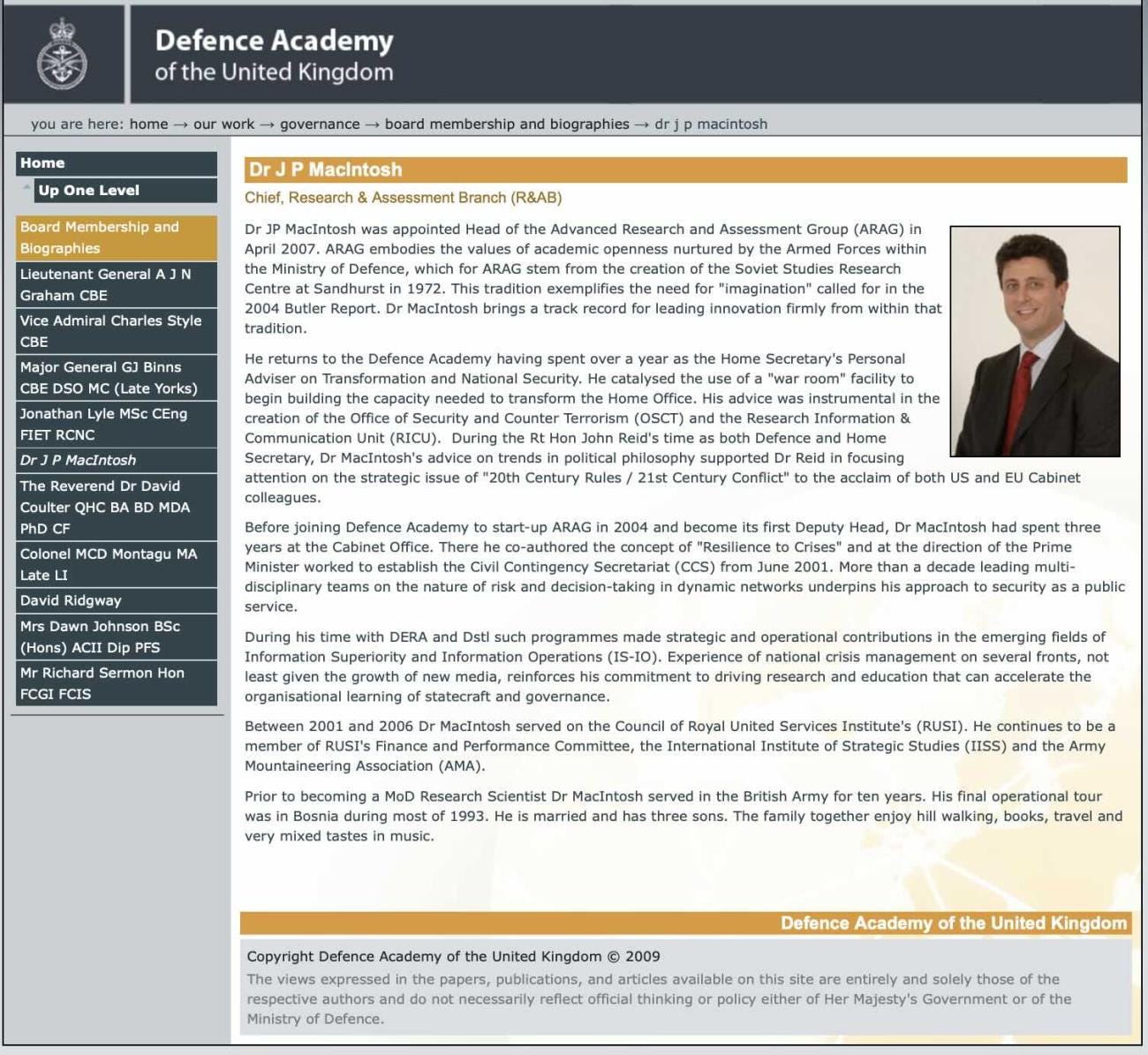 Before being appointed the head of ARAG, Macintosh spent over a year as the personal advisor on Transformation and National Security to Home Secretary John Reid. A long deleted MoD biographical note claimed that he was “instrumental” in the creation of the Office for Security and Counter Terrorism (OSCT) and its strategic communications division, the Research, Information and Communications Unit (RICU).