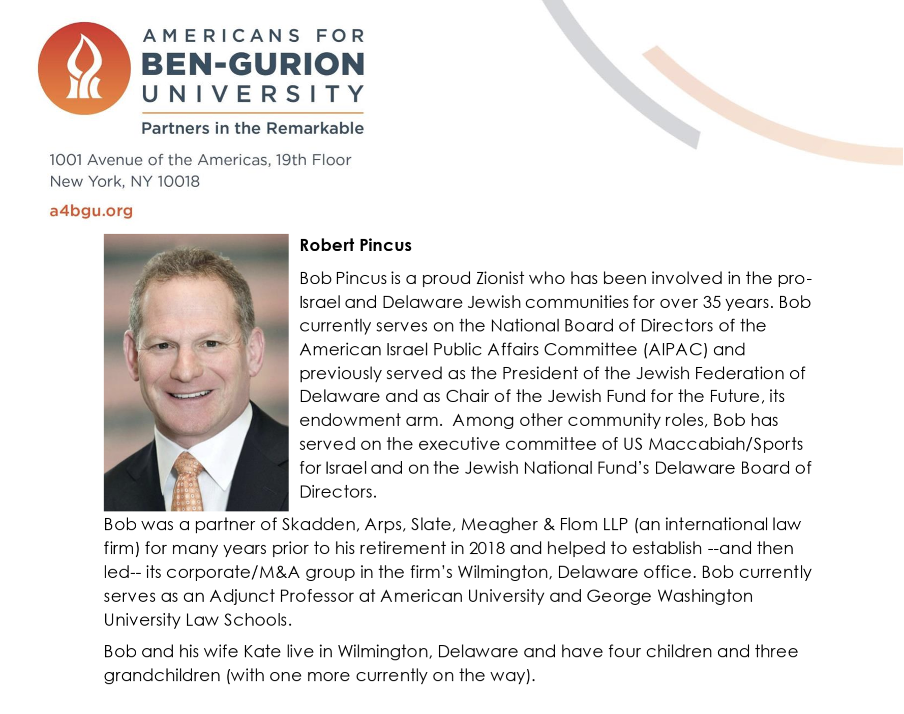 And who is Robert Pincus who chose Singer’s firm? Robert “Bob” Pincus refers to himself as a ‘proud Zionist’. He led Skadden, Arps, Slate, Meagher & Flom’s corporate practice in Wilmington, Delaware, and chaired the firm’s Partnership Selection Committee for many years until retirement in 2018. Leonard Stark, the Judge who appointed him had also worked at Skadden, Arps, Slate, Meagher & Flom, at the same time, between 1997 - 2001.